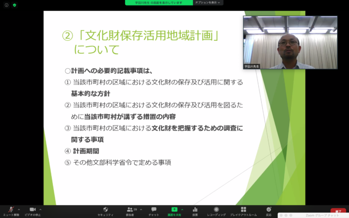 さらに最終講時では、文化庁の宇田川滋正先生に、現在の文化財行政の課題についてお話し頂き、後半では津村先生も交えてZoom内でのディスカッションなども行いました。
