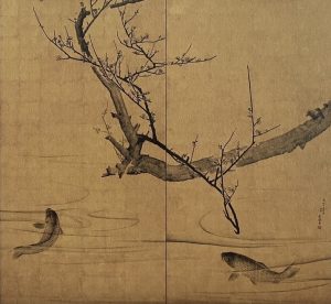応挙の「梅鯉図」の方が1787年、若冲の「竹鶏図」が1790年となっているので先に応挙が描いたのです。