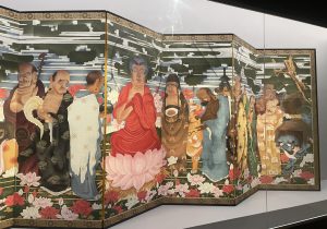 次の部屋は小さな白黒写真から復元された若冲の色鮮やかな「釈迦十六羅漢図屏風」。