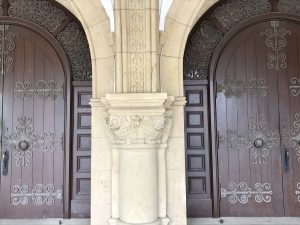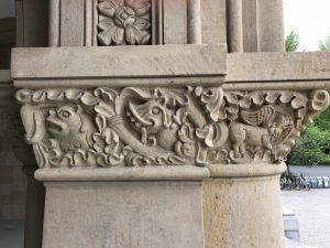 伊東忠太の怪獣達が最も多く生息しています。その数100を超えるとか・・・三角屋根、ロマネスク様式の建物だそうです。階段を上がると三連のアーチと柱があります。その柱には空想の怪獣が柱を飾っています。