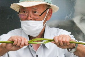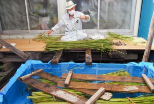ここでは特に〈昭和村からむし生産技術保存協会〉の皆川吉三会長が、炎暑のなか、自ら畑での刈り取りをし、茎の表皮を剥ぐ「からむし剥ぎ」を見せてくださり、作業場では、織姫さんたちが、さらにその表皮を「からむし引き」して、繊維を取り出すところまで見ることができました。