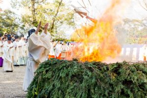 こうして本殿祭が営まれたのち、午後2時から場所を本殿の東奥に当たるお山祭場に移して、いよいよ火焚神事が執り行われます。祭場には、井桁に組まれた3m四方、高さ1.5mの大きな火床3基が設けられており、そこに古式に則って起こした斎火がつけられます。宮司様はじめ、神職、神楽女、崇敬者らが大祓詞(おおはらえのことば)を唱え続ける中、火の立ち上がった火床に、火焚串が投じられます。