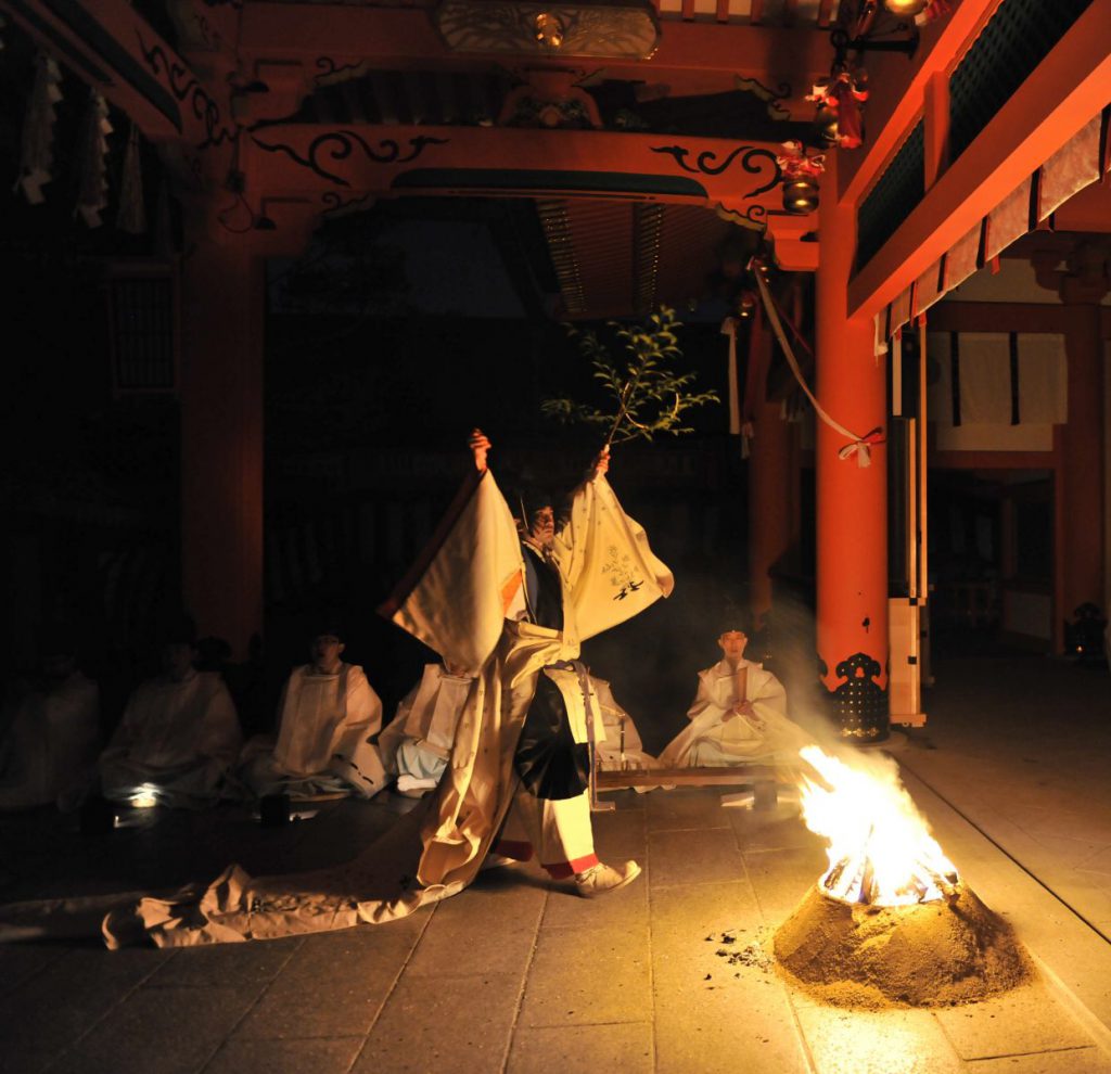 これは、平安時代に宮中で行われていたお火焚きを引き継ぐもので、神前に燎(にわび)を焚いて行われる神楽です。