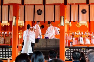 さて、じつはもう一度夜のお稲荷さんに戻らなければならないのです。このお火焚きの夜、午後6時から伏見稲荷大社本殿の神前で行われるのが御神楽(みかぐら)です。
