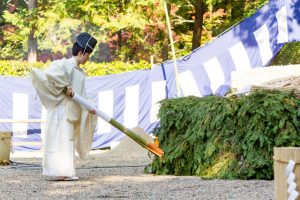 まず午後1時 本殿において火焚祭が行われます。神前に神饌が供えられ、祝詞があげられ、本殿前に立てられた新藁に斎火(いみび)が着けられます。さらに神前で神楽女の舞が厳かに捧げられます。