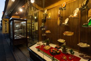 そしてこの通りには、本学の三味線部もお世話になっている和楽器店「金善楽器店」や、祇園の芸舞妓さんをはじめ、女性の足元を彩る装履(ぞうり)や下駄を調整されている「祇園 ない藤」が並びます。「祇園 ない藤」は、すっかり正月準備の整ったお店先となっておりました。
