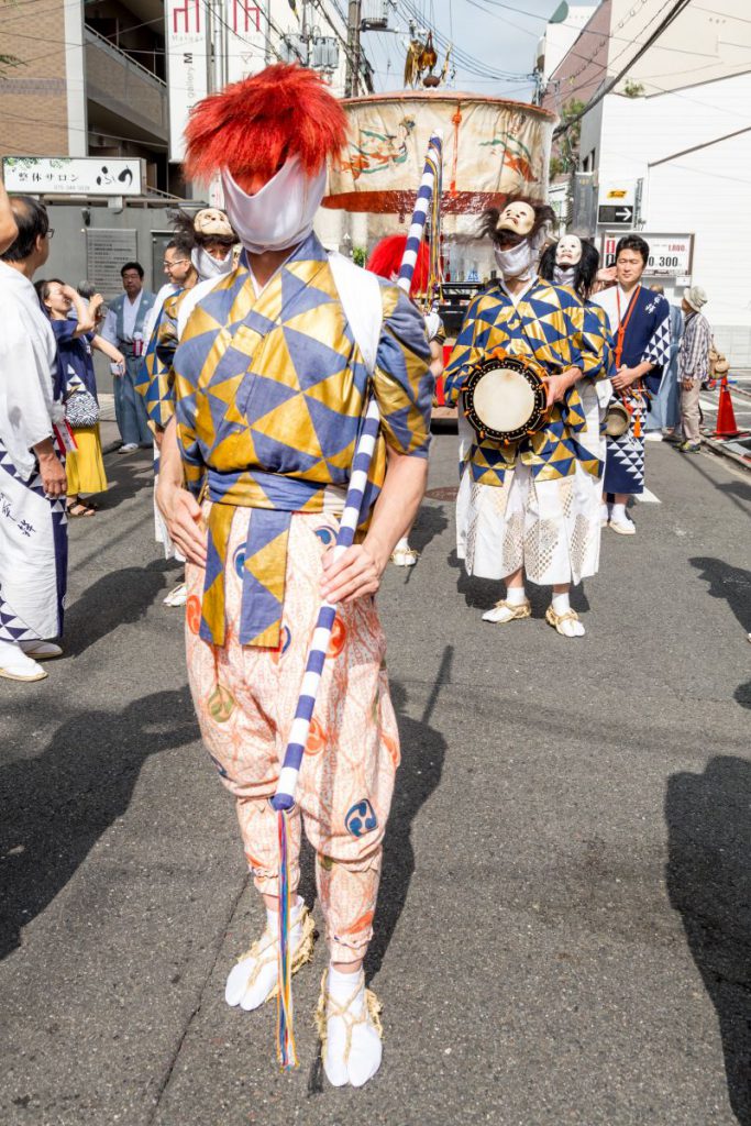 しかも、現在の綾傘鉾では6人ものお稚児さんが、赤い差掛け傘で先頭を歩みます。これに続いて壬生六斎念仏講中の方々による棒振り、締め太鼓、笛と鉦のお囃子が練り歩き、2基の大傘が続くという長大な巡行列となっています。「風流囃子もの」の鉾として、山鉾の中でもひときわ目を引く華やかな存在となっているのです。