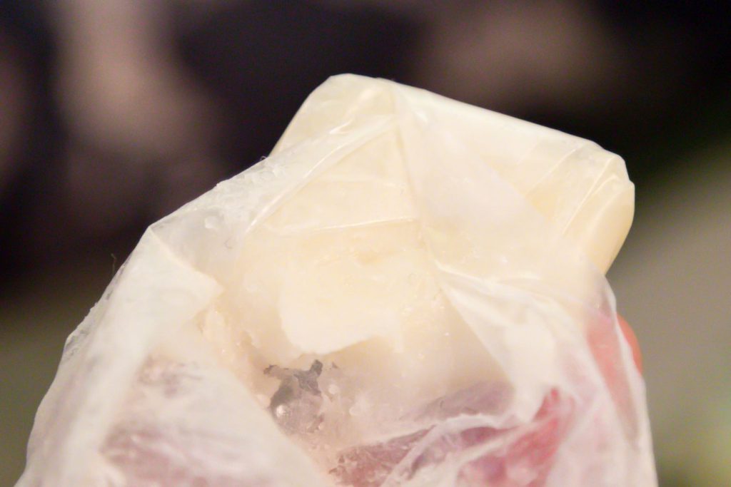 お稚児さんが着用する狩衣や水干は、袖を括ることもできるように、袖口に組緒(くみお)が通されています。「ういろう」におそらく粉をつけた凸型の器具でくぼみをつけているのではないかと思うのですが、その一線が加わることだけで、四角い「ういろう」が狩衣の袖に見えてくるのです。「ういろう」が薄物のように、質感の違う白い線が組み緒のように。上品な夏の装束のイメージが出来あがります。