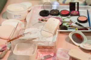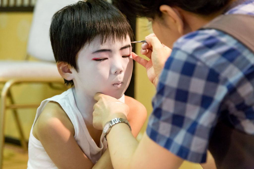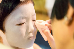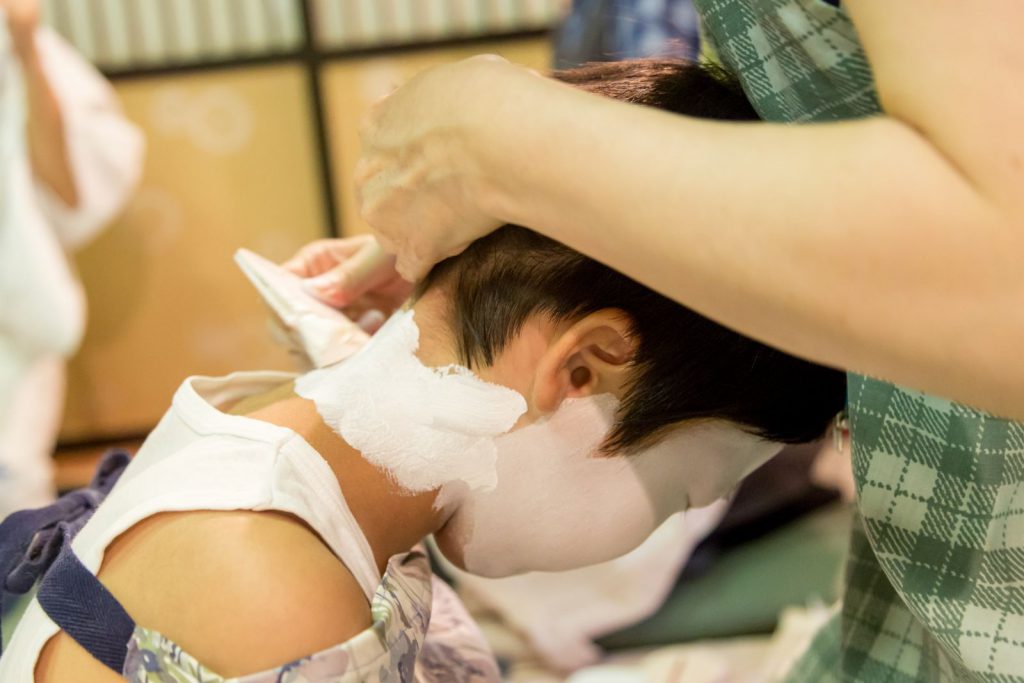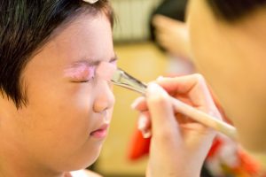 まぶたの上にピンクの水おしろいをつけてから、お顔全体に刷毛で白い水おしろいを塗り、上から粉おしろいでおさえます。首の後ろ、前にも水おしろいを刷毛で塗り、粉でおさえて落ち着かせます。眉からまぶた、目頭にかけてピンクの粉をはき、きりりとした黒い眉を描きます。眉の輪郭を細い筆につけた水おしろいでくくって眉を際立たせ、まなじりに赤、ピンク、朱色を混ぜた少し強い紅のラインを入れます。ここまできますと、いよいよお顔の白さが神々しく、輝きを放ってきます。神の使いとしての稚児のお顔が生まれてまいります。