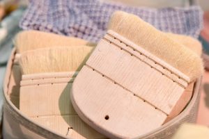 白粉(おしろい)などを塗る前に、透明なクリームのようなものを塗りこまれていたので、傍から質問しますと、最初に鬢付け油を塗って下地を作るのだそうです。化粧崩れを防ぐためだそうですが、お相撲さんが髪につけられる鬢付け油より、軟らかい番手のものを使われているとのことです。ただこの鬢付け油の量のほんのわずかな違いで、仕上がりのおしろいの白が違ってくるのだそうです。