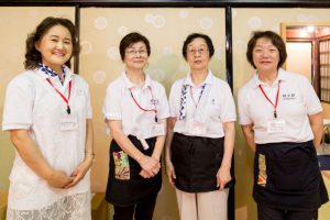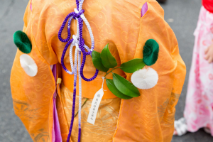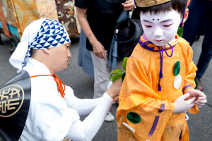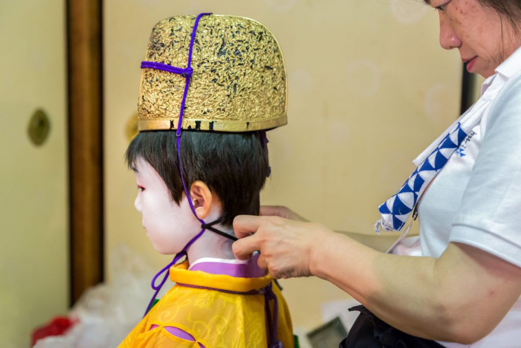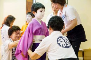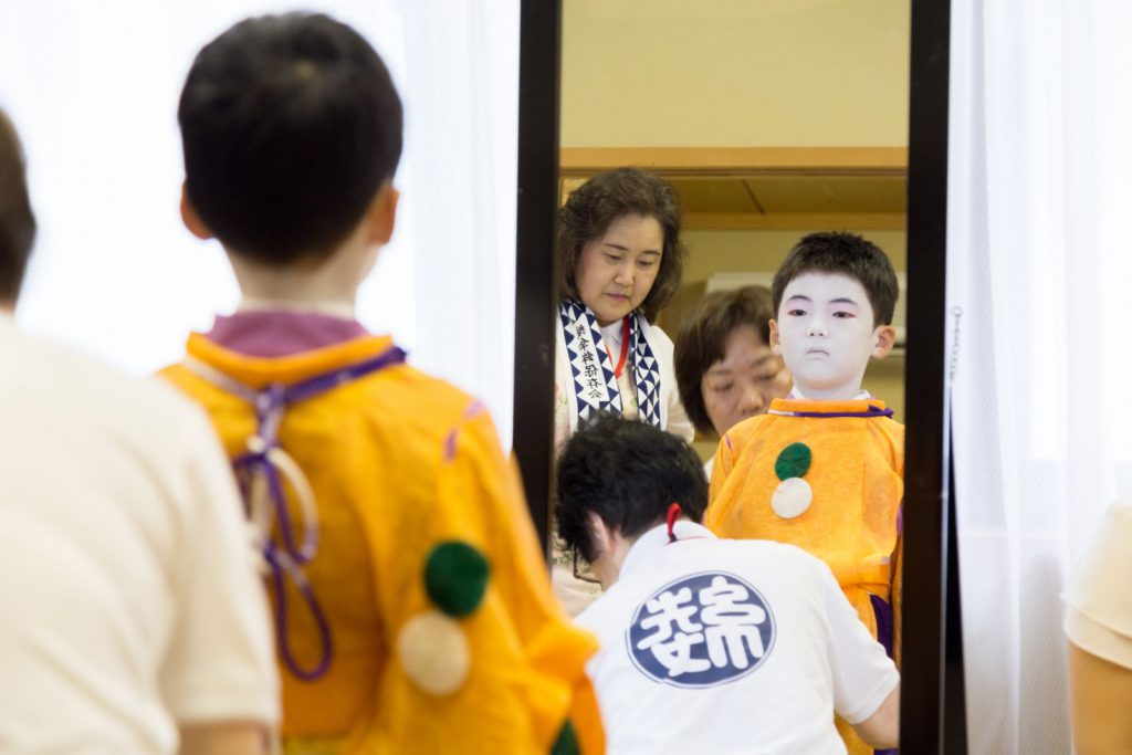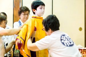 こうした裏方を支えるのは、全て女性達です。お化粧は、稚児の化粧で名高い顔師、奥山恵介氏を師として技を磨かれた「化粧方」の女性です。この日のお父様や保存会の皆さんの紋付袴、また巡行当日のお供衆の裃も、すべて着付けを担当されるのが、綾傘鉾の善長寺町女性会の皆さんなのです。