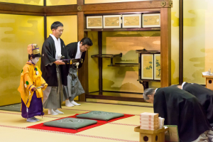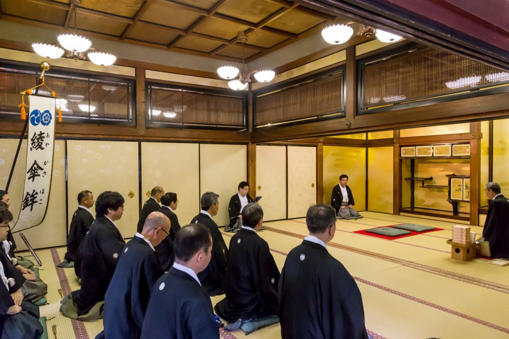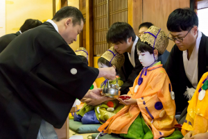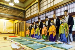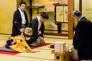 こうして、いよいよ皆の装束が仕上がると「常盤御殿」での結納の儀が行われます。お稚児さんは、一人ずつ名前を呼ばれると、「はい」という大きな声で応えて、お父様と一緒に座敷の中央に進み、綾傘鉾保存会理事長の寺田進様の前に座ります。