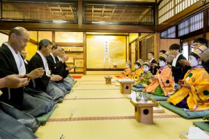 稚児の皆さん全員が結納のやりとりを終えると、次の間で綾傘鉾保存会理事会の方々と共に、揃って固めの盃をいただきます。