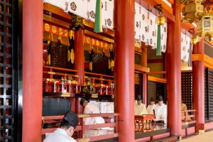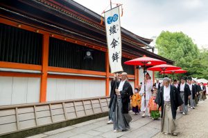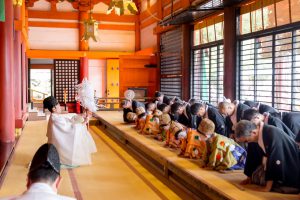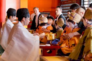 そして、いよいよ八坂神社への社参です。お稚児さんには赤い傘がさしかけられて、神社の南に位置する楼門から境内に列をなして進みます。手水(ちょうず)を使ったのち、本殿の中に通していただき、神前の一列目にお稚児さん、その後ろにお父様が座ります。