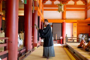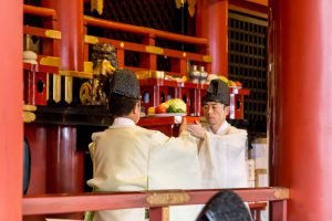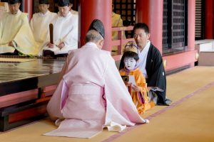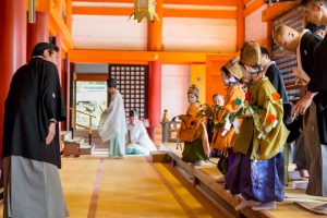 そして、稚児がそれぞれ玉串を奉奠(ほうてん)します。続いて保存会理事長の寺田様が神前に進まれ、玉串を奉奠され、全員で柏手を打ち参拝します。