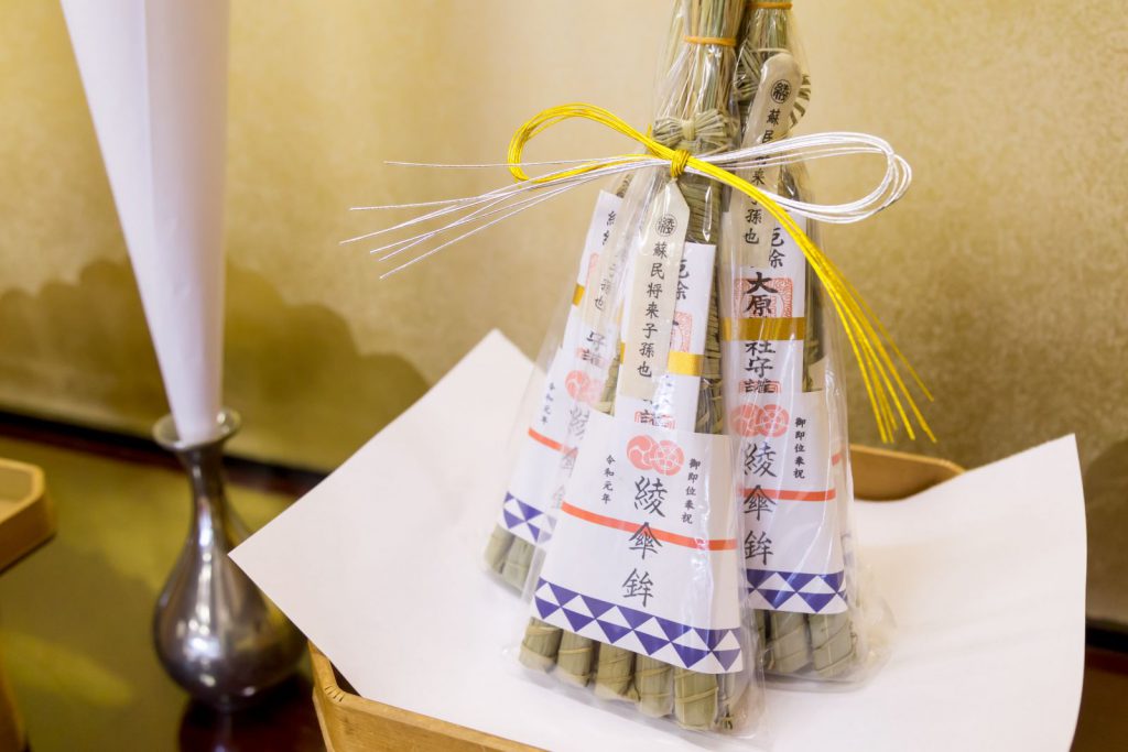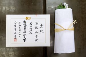 この後、稚児ひとりひとりに験(しるし)の杉が授与されます。この杉にも「蘇民将来子孫也」の護符がつけられています。