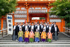 こうして、稚児らのお千度参りが終わりますと、神社の南楼門前で一同揃っての記念写真の撮影です。梅雨のさなかのこの時期、年によっては雨に降られることもあるそうですが、この日は雨降りにあうこともなく無事に社参の儀を終えることができました。