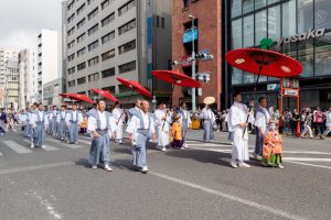 巡行は、四条烏丸を出発点として、四条通りを東に向けて進みます。これは四条通りの東の突き当たりにある八坂神社の方を向いて進むことを表します。そういう意味で四条通りは祭の中でも厳粛な行程とも言えます。稚児列を先頭に棒振り囃子の一行はお囃子を奏でながら進み、これに風流傘が続きます。