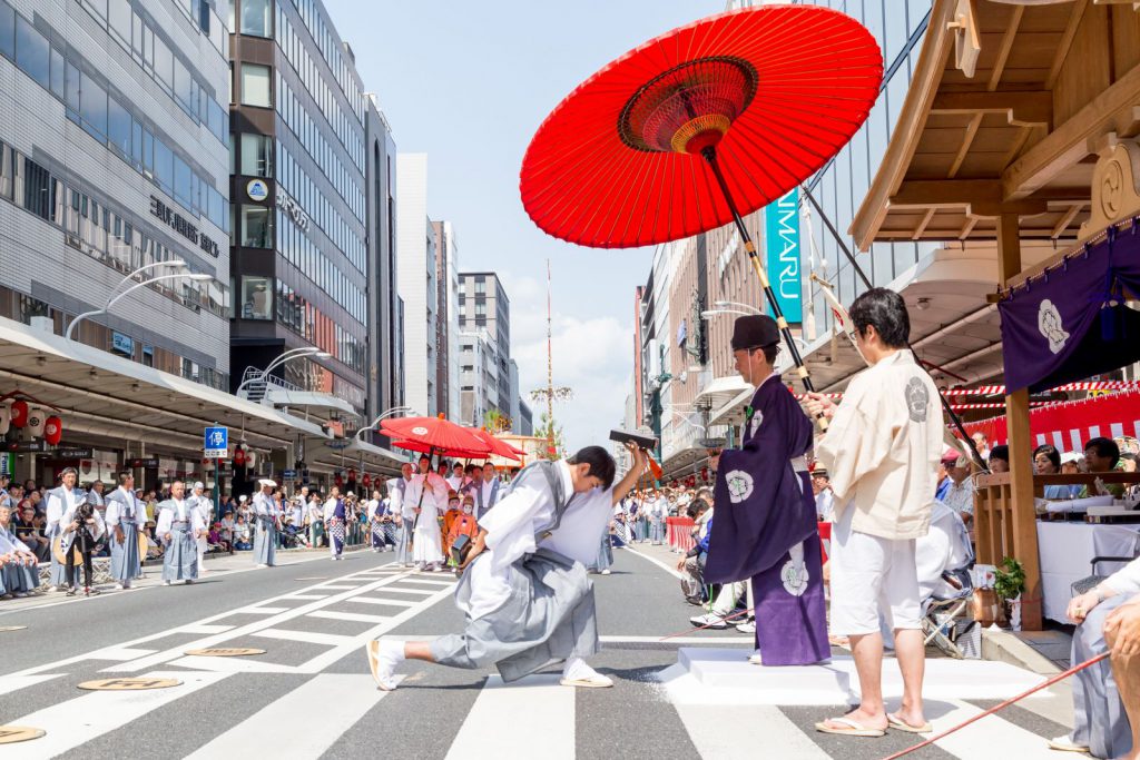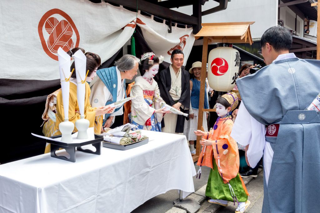 三条河原町では、舞妓さんをはじめ祇園甲部の方々も山鉾を待ち受けておられ、奉納のお品と粽のやりとりも行われます。