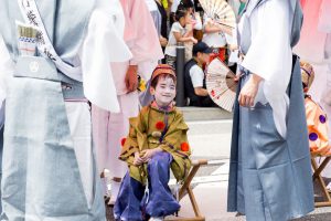 こうした踊りが行われるような間、お稚児さんたちは椅子に腰掛けて、小休止です。途中でトイレに立つこともなかなかできないため、水分補給も慎重にしなければならず、随行しておられるお父様方が扇であおいだりして、なんとか涼を取るという具合で炎天下の巡行を凌ぎます。