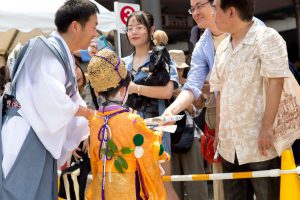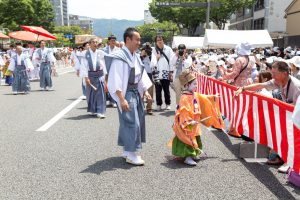 そして、この観覧席ではお稚児さんのお知り合いの方が待ち構えておられる場合もあり、知り合いを見つけると、お父様と一緒に粽を持ってご挨拶に行かれることもあります。
