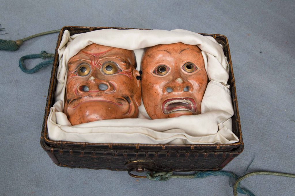 元治元年(1864)の禁門の変(蛤御門の変)によって、京都は壊滅的な大火に襲われ、祇園祭の山鉾町も大きな被害を被りました。綾傘鉾も、屋根周りと傘は残ったとされますが、ほとんどのものがこの火災によって焼失したようです。焼失を免れたもののひとつに二人一組で行われる締め太鼓が額上につける面がありますが、これは現在では、神面として宵山期間、町内大原神社のお飾り所に安置されます。鉾焼失後もしばらくはこの神面を入れた唐櫃による徒歩巡行が行われていましたが、明治4年(1871)から同11年(1879)まで休み山となり、明治12年(1879)から同17年(1884)まで徒歩囃子の形で巡行に復帰したものの、それ以降再び巡行参加は途絶えてしまいました。