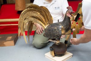 稚児の準備をしている間、外では2基の風流大傘を仕立て、江戸時代からの金鶏を1基目の傘に取り付けたりと、巡行の準備に大わらわです。この間、雨がぱらついてきたので、大傘にはビニールがかけられていましたが、出発までに雨も止み、巡行にはビニールを外すことができました。