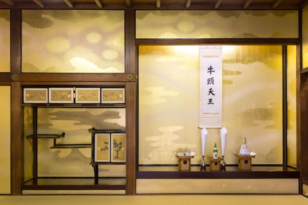 そして7日は、八坂神社の常盤(ときわ)新殿の中にある常盤御殿で、いよいよお稚児さんの結納の儀が行われる日です。常盤御殿は、普段非公開となっていますが、これはもともと、伏見・後伏見・花園・光厳・ 崇光・後光厳天皇の持明院系六代の御所が営まれた場所にあった建造物です。
