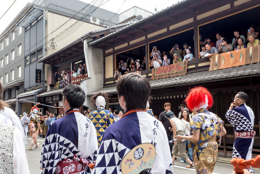 地元の人は、新町通を南下してくるこの道中を好んで待ち受けます。狭い新町通を大きな鉾が通過する臨場感を楽しんだり、町家の二階が、鉾のお囃子の高さと近いことから、二階から、お知り合いの方に声をかけたりと、観光とは違うかつての祭の楽しみ方が色濃く残っているのです。
