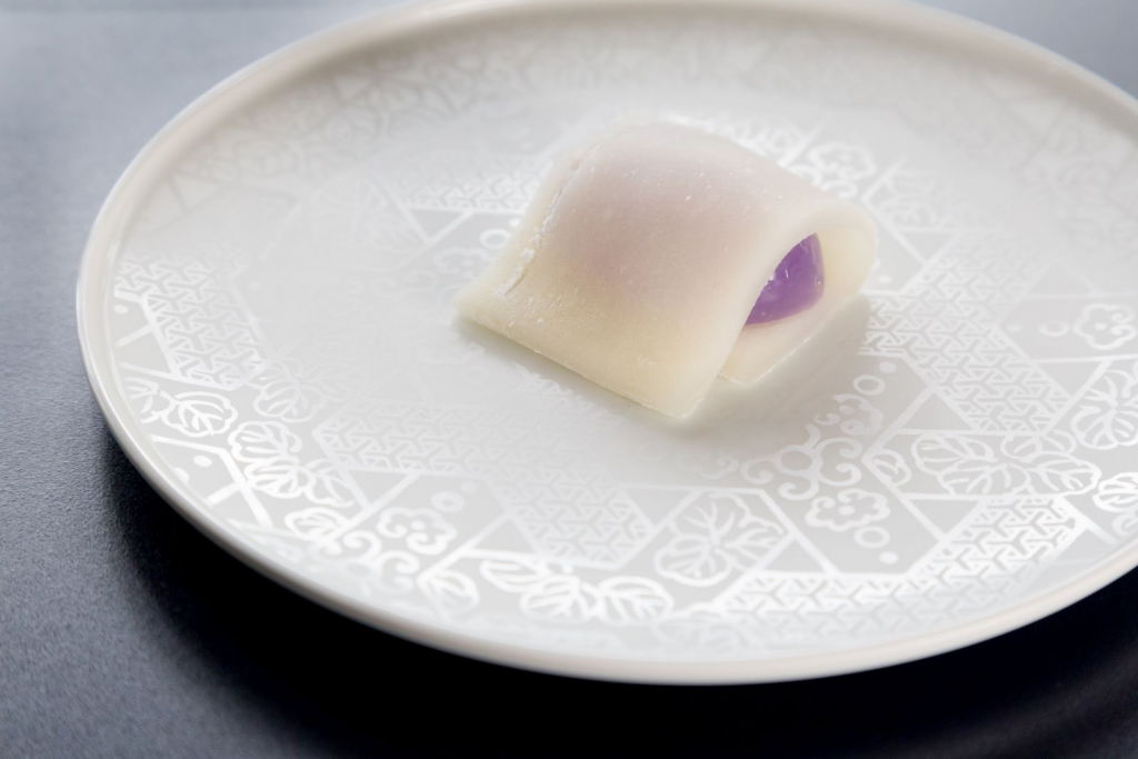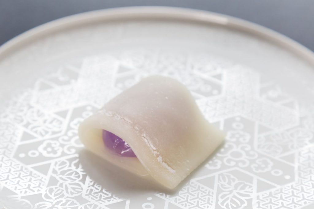 中に包まれる小豆を使わず葛だけでできている薄紫色の餡は、袖の間から覗く小袖の色をあらわすように見えてきます。その葛の透明感が見た目の涼やかさをさらに高めています。