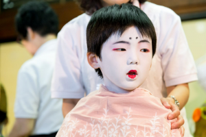 薄物とはいえ、着物を重ねるにつれ、おそらくこの年頃の男児にとって、この夏の季節には着たこともないほどの厚着となっていくのですが、この後の一連の行事を全て終えた後も、化粧が崩れることもなく、涼しげなままに見えるのは、さすがの化粧の技とお稚児さん本人らのしっかりとした心構えの故と言わざるをえません。