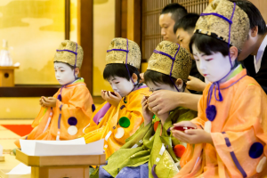 神職の方のお祓いを受けた後、神前に神饌が供えられ、八坂神社宮司の森壽雄様の祝詞(のりと)奏上があり、その後ここでも「稚児神酒拝戴(はいたい)」が行われます。まさに神との契りの盃ということになります。この時、榊の葉ですくった米粒を懐紙にいただき、口にするという所作も加わりますが、いずれも本当に飲食するわけではありません。