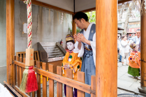 それを聞いて、厚かましくも本記事での取材を願い出たところ、彼女のお口添えのおかげで、綾傘鉾保存会にも特別のお許しを頂き、綾傘鉾とお稚児さんの祭での一部始終を実見できるというまことに貴重な経験をさせていただいたのでした。