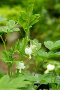 それは白花の鯛釣草と先代萩です。去年は赤い鯛釣草を4月に見かけたのですが、今年は赤いものはすでに終わっていて、見頃の花をつけていたのは白花でした。少しユーモラスのあるまさに鯛を彷彿とする赤花の姿とは違い、なんと上品な愛らしさでしょうか。